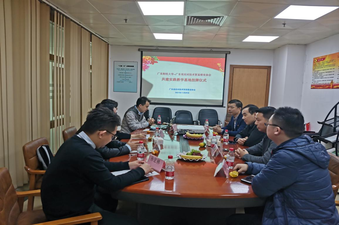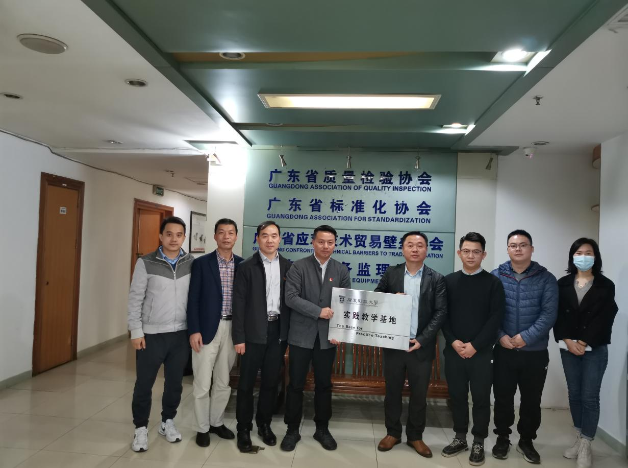 交流结束后,双方签订了实践教学基地协议,广东财经大学公共管理学院钟智书记、姚军院长为实践教学基地授牌,广东省应对技术贸易壁垒协会陈超青会长作为实践教学基地代表接牌。